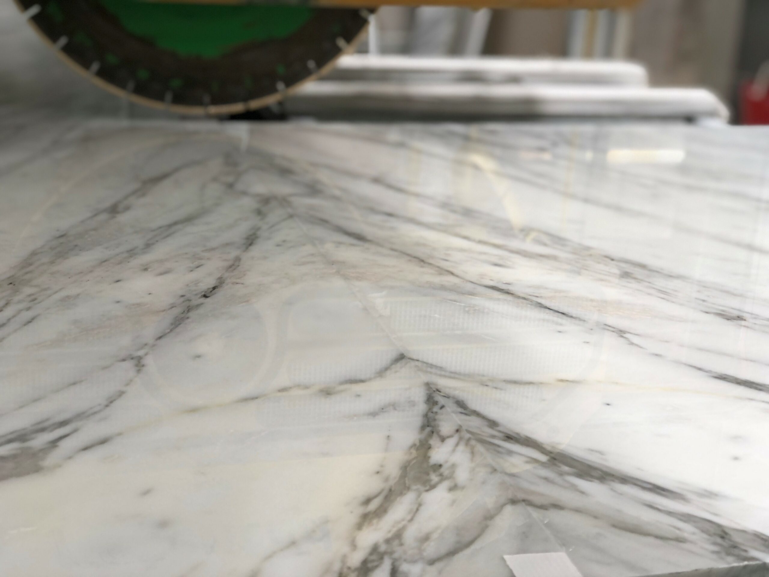 Cutting a book matched pattern with a CNC circular saw for a marble stone interior. Its a precision job with stunning results.