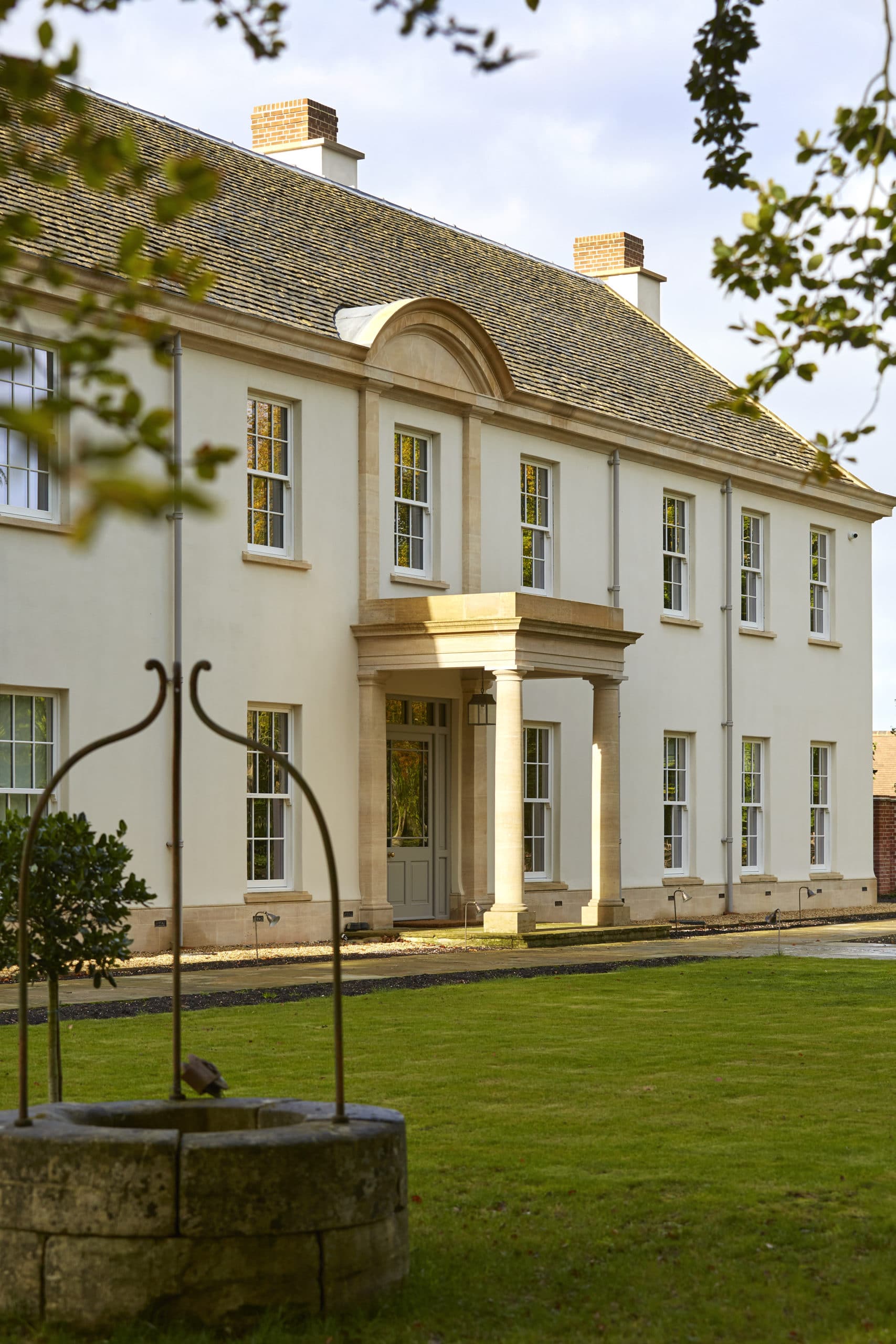 Knighton Mill is a contemporary new-build home where bold glass and flint are balanced by traditionally detailed Bath stone ashlar and a robust gritstone plinth.