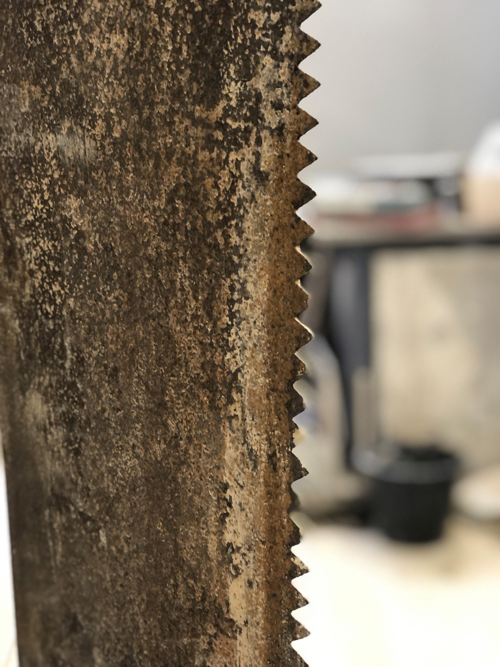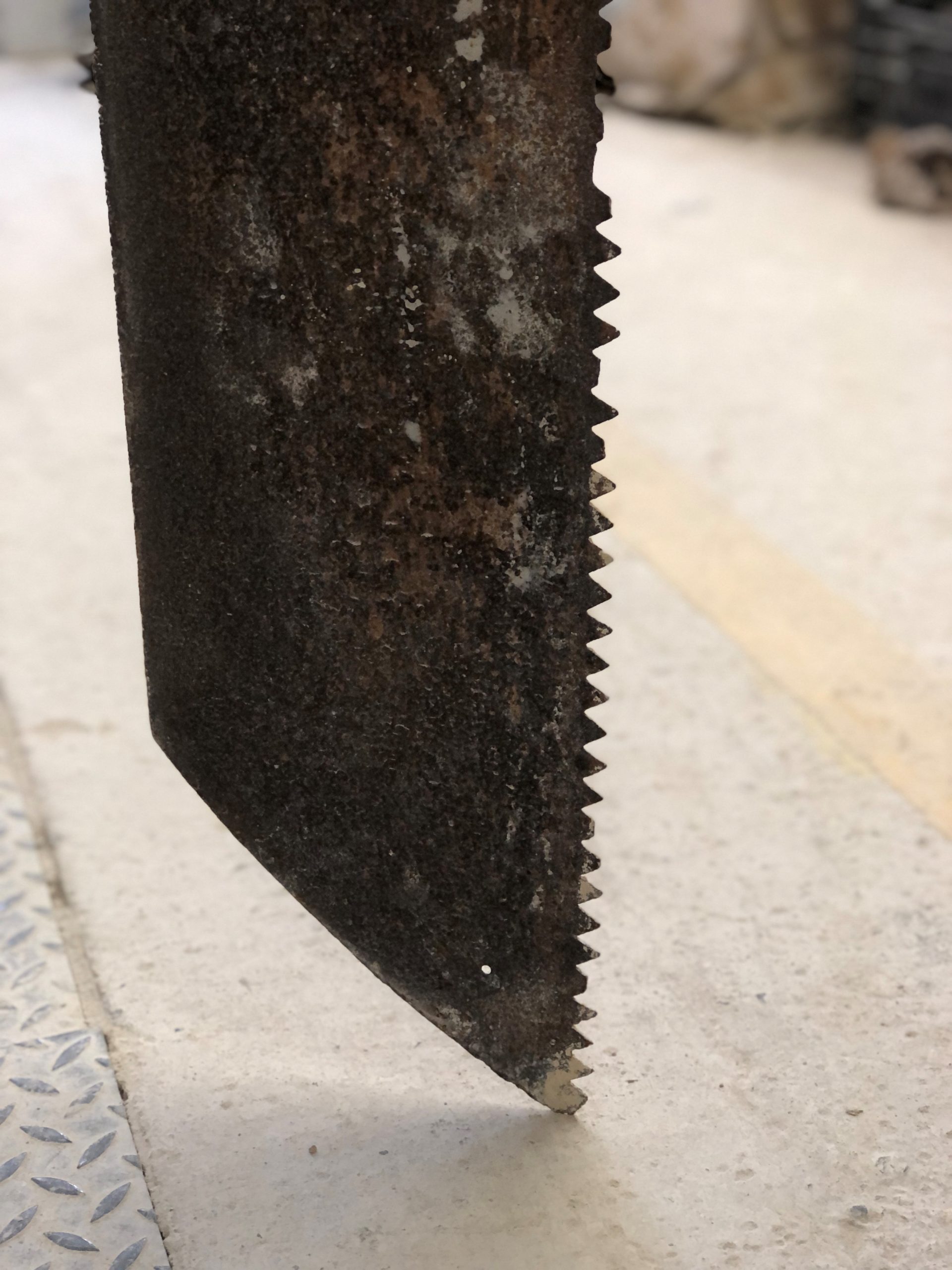 These soft-stone saws, like most traditional stone saws and drags have teeth cut as straight, non-angled edges to scratch though stone, unlike their wood saw counterparts which have their teeth angled to help cut cleanly through timber.